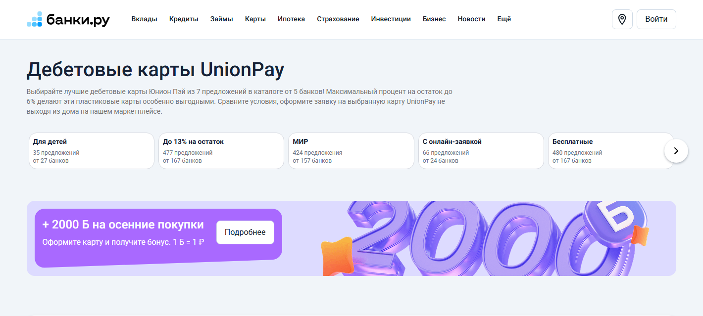 UnionPay — платежная система международного типа, созданная в Китае и сегодня представленная в более чем 180 странах мира. В России она активно используется для онлайн-и офлайн-покупок, переводов и снятия наличных в банкоматах, поддерживающих данный формат. Важно отметить, что мы не оказываем услуги в финансовой сфере, а лишь предоставляем информационные материалы об услугах, предлагаемых третьими лицами, без сравнения между ними и без намерения формировать интерес к конкретным поставщикам.
