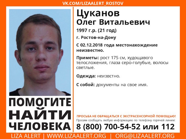 В Ростове-на-Дону загадочно исчез молодой человек, 21-летний Олег Цуканов. Родные ищут его еще с начала декабря.