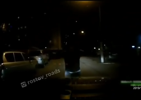 На записи видно, что водитель медленно передвигался по темному двору, но в свете фар заметил мужчину, который вместо того, чтобы уступить дорогу, пошел наперерез автомобилю, расставив руки. Автовладелец успел вовремя затормозить, и пешеход не пострадал от столкновения, зато получил пару звонких ударов от перенервничавшего водителя. Мужчина вышел из авто и проучил злодея.