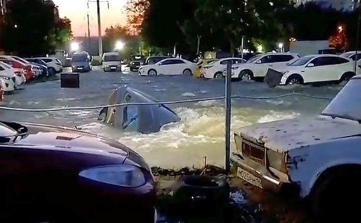 В социальных сетях очевидцы поделились видео с места происшествия. На кадрах видно, как затопило автостоянку. Под одной из машин образовалась глубокая яма, и авто практически полностью ушло под воду.