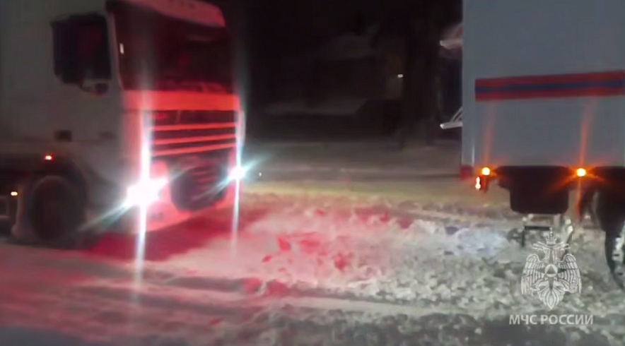 Снежный плен под Аксаем: тяжелая техника МЧС вытягивает фуры на обледенелых подъемах
